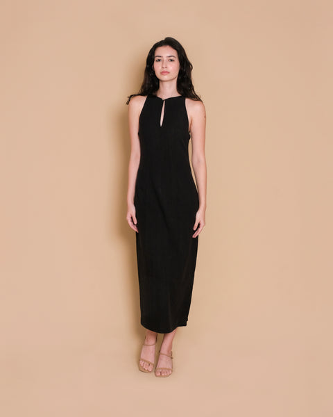 Featuring cut-in shoulder and keyhole neckline at the front while having low V at the back. Armhole is made lower than usual for a sassy look, added with sashes at both sides. Completed with functional button at the neckline and concealed zipper closure at the back. It is fully-lined.