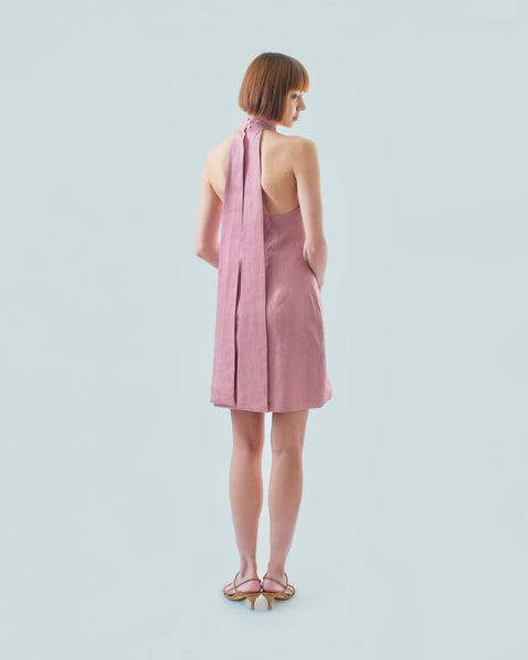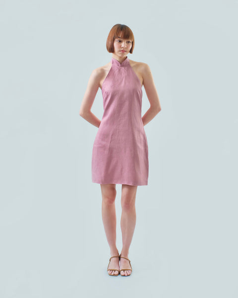 A mini dress designed with mandarin collar and flowing flaps at the back of the neck all the way down to the hem. A fresh take on modern cheongsam. Finished with button and concealed zipper closure at the back. It is also fully-lined.